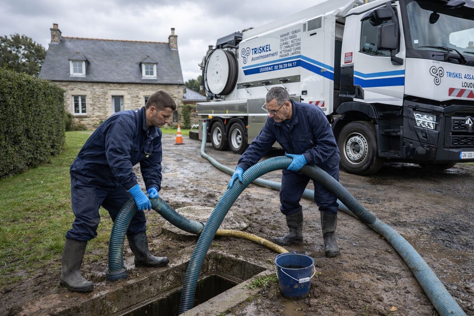 Basée à Loudéac, Triskel Assainissement intervient pour entretenir et sécuriser vos installations : vidange de fosses septiques, curage de réseaux, débouchage en urgence, nettoyage de cuves à fioul et inspection caméra des canalisations.